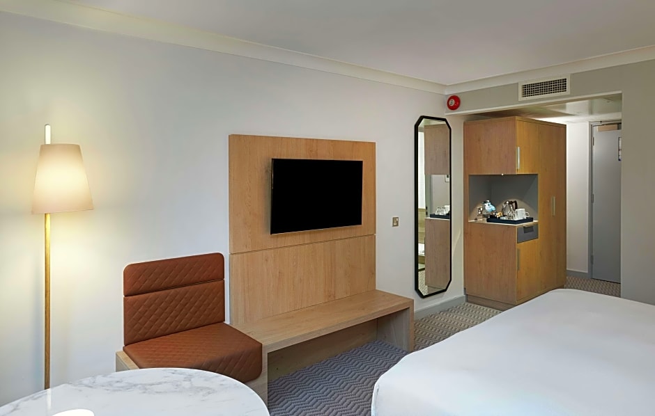This contemporary, recently refurbished guest room has a 40-inch LED TV, work space and WiFi and features a king-sized Hilton Serenity bed and a single sofa bed. The room features an elegant bathroom with exclusive toiletries. Additional features include tea/coffee making facilities, fluffy bathrobes, slippers, USB socket, mini fridge, and safe.