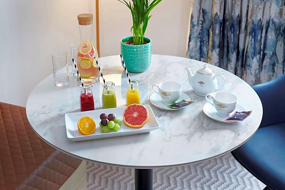 This contemporary, recently refurbished Junior Suite with special wellness features has one king bed and double sofa bed, 2 separate rooms - one bedroom and one lounge/dining and 40-inch LED TV, Wi-Fi, work space, bathrobe, slippers. The stylish bathroom has luxurious toiletries with a fluffy bathrobe and slippers. Wellness features include essential oil diffuser, Himalayan salt lamp, fruit smoothie, organic Hope and Glory teas, fruit-infused water, yoga equipment and a Wellness Evolve Set . Additional features include tea/coffee making facilities, USB socket, mini fridge, and safe.